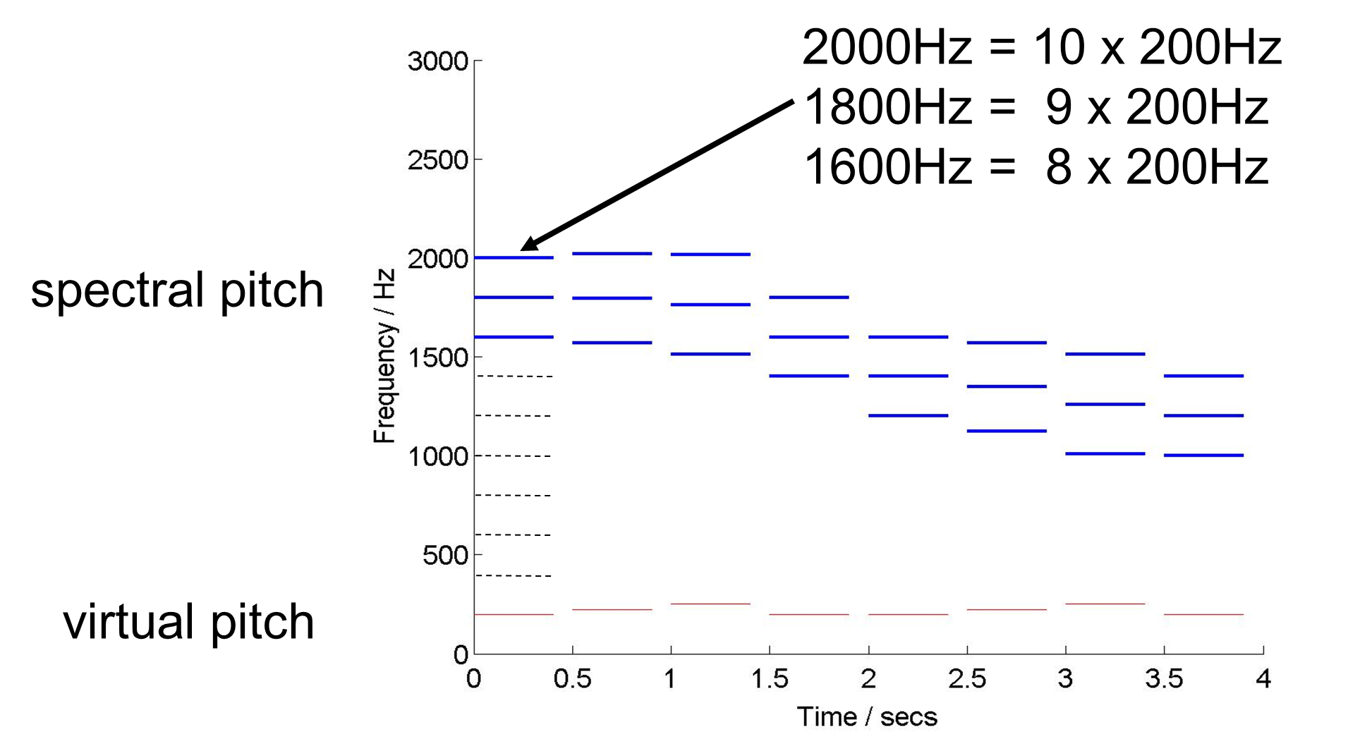 If we then rearrange these partials slightly, we can induce an even stronger sense of virtual pitch—various missing fundamental frequencies which are not physically present in the tones themselves: