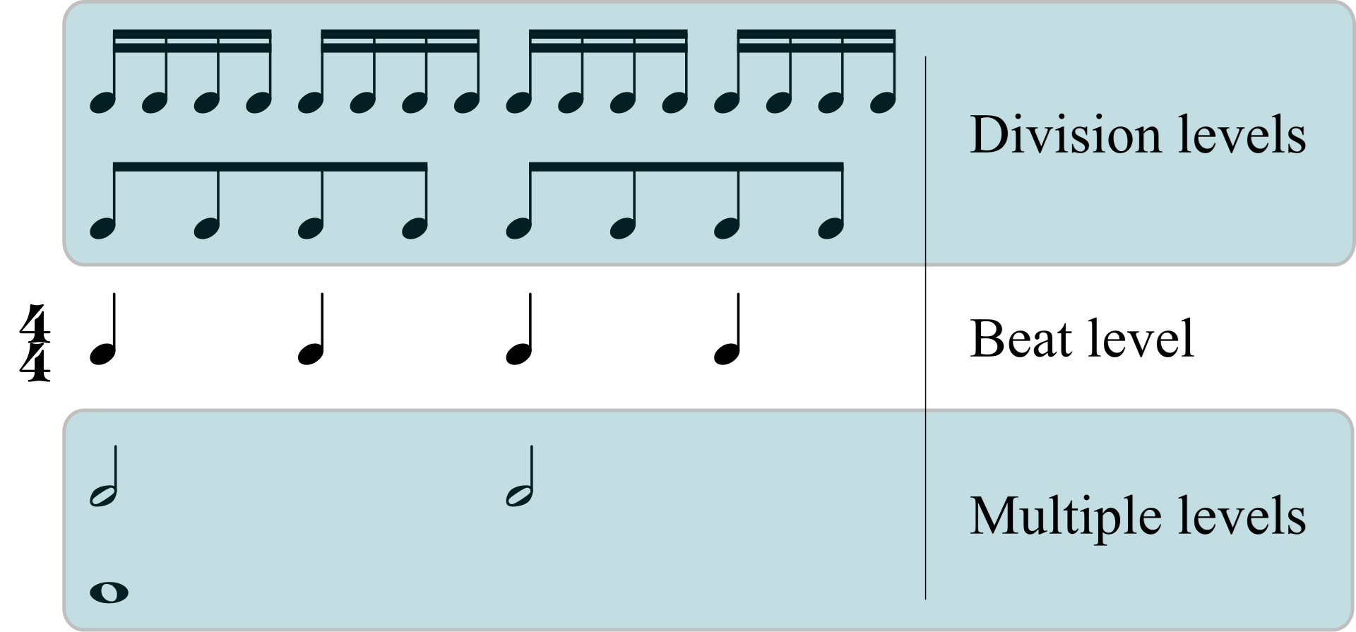 - Multiple levels: slower groupings of the beat, half-notes, bar-lengths, etc.
