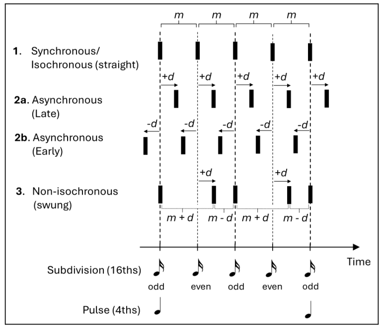 Asynchrony tends to be measured as the absolute positive (late) or negative (early) value of signal onset displacement (d) relative to a fixed timing reference grid (often isochronous) in milliseconds (example 2a and 2b below). Swing is commonly quantified in two ways: either as simply the absolute onset displacement (d) from a grid of an even-numbered/off-beat subdivision event (in milliseconds), or as the ‘swing ratio’ (R) between the relative duration of an odd-numbered subdivision event (m + d) and a subsequent even subdivision (m − d), where m is the mean inter-onset-interval (IOI) rate of the subdivision level (example 3). Swing ratios are thus calculated by the formula: 𝑅 = 𝑚 + 𝑑 / 𝑚 − 𝑑, and may be expressed as a ratio (e.g., 1.5:1 [‘medium swing’]) or more simply as a decimal (e.g., 1.5).