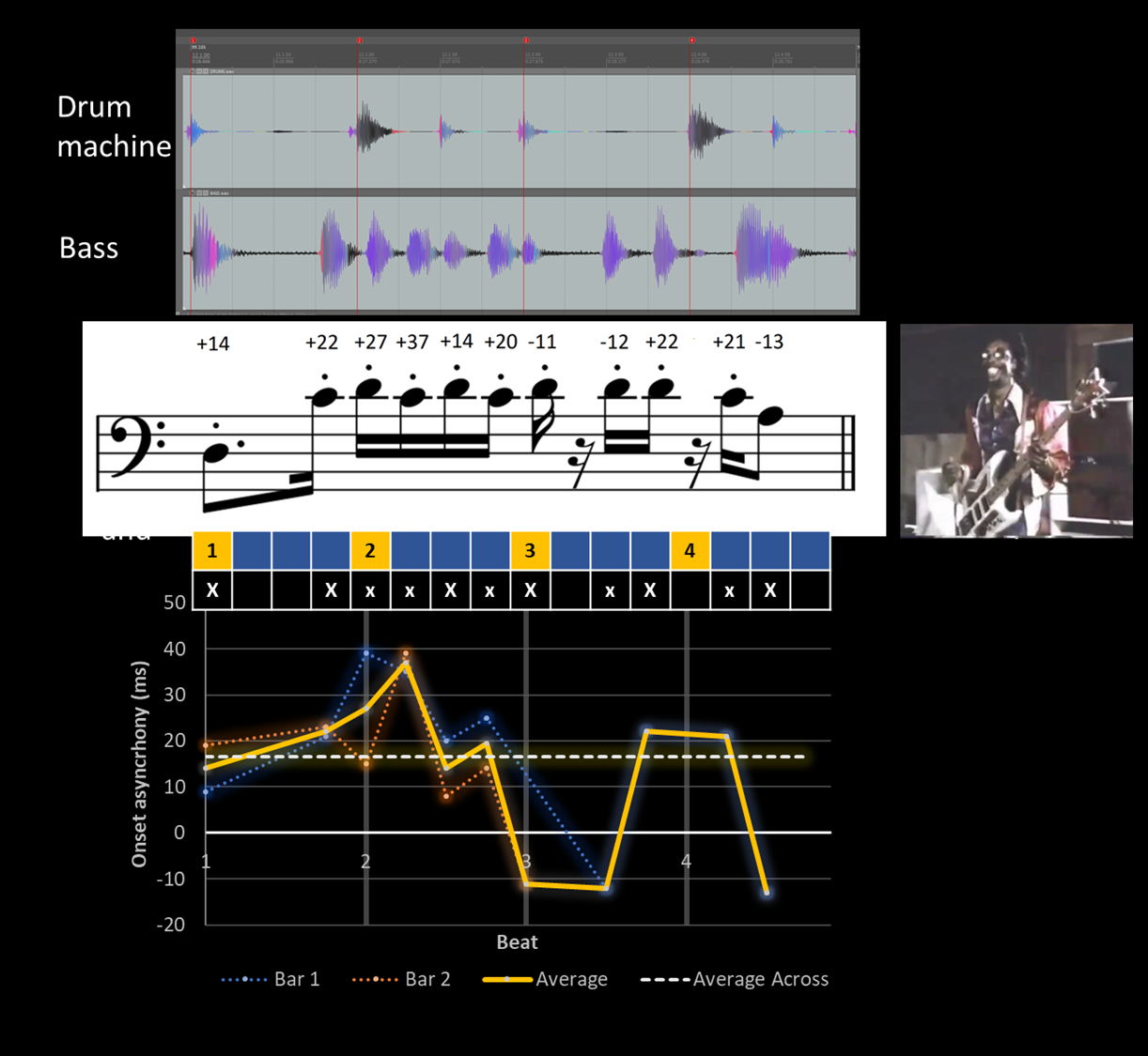 We can look at an example where Bootsy Collins (bassist from James Brown Band and Parliament-Funkadelic) is playing[^7] along to a highly isochronous drum machine groove, which serves as a convenient stable time reference to measure bass onset asynchronies against (listen to Audio Ex. 3, where the 2-bar bass and drum riff is looped 3 times). An onset timing analysis reveals that Bootsy systematically plays slightly behind the beat at around +15 ms on average (dashed white line in plot)—what Stewart might call “in the pocket” playing), and furthermore, he does so in the same systematic way in both bars (red and blue lines).