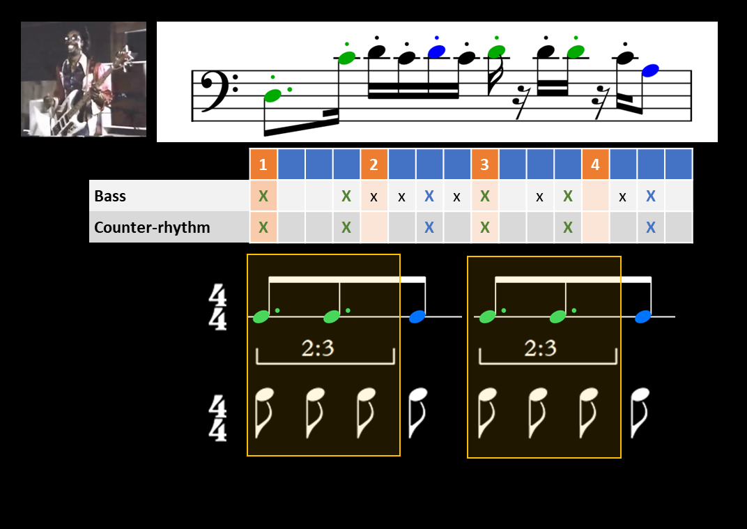 Once again, returning to the more complex Bootsy Collins riff we saw earlier, this time, what appears on the surface to be a dense pattern with many 16th notes could be construed as roughly accenting a typical counter-rhythm often found in groove-based music: a 3-3-2 (repeated twice) (see below for transcription, and listen to Audio Ex. 11, where the counter-rhythm is overlaid by a clave). Although this counter-rhythm produces constant 2:3 cross-rhythms, they never fully create the sense of a triplet pulse above the main binary 4/4 beat, as the bass groove always returns to accent the main meter beats before this happens.