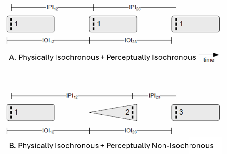 When listening to rhythms, the “moment of occurrence” of a sound—the point we use to place it in time—often does not coincide with its physical onset. This percept is often called the perceptual center (P-center) or perceived attack time (PAT): a subjective reference point that typically falls somewhere after physical onset and before the peak of the sound’s energy. As a result, sequences that are physically synchronous or physically isochronous may be heard as misaligned or uneven.