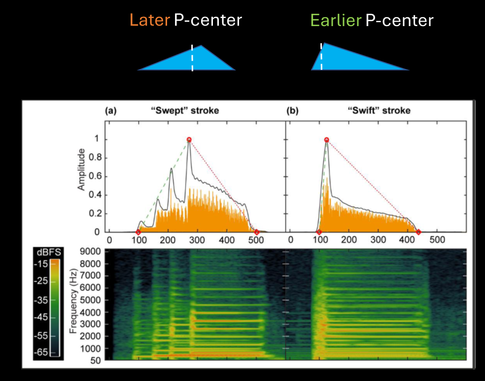 Take two guitar chords for example, one played by slowly arpeggiating the strings (“swept”) and one played fast by stroking all the strings in quick succession (“swift”). Although both are produced by the same instrument, the swept stroke will tend to sound as if occurring slightly later relative to its physical onset compared to the swift stroke, where the P-center will tend to be much closer to its onset timing.