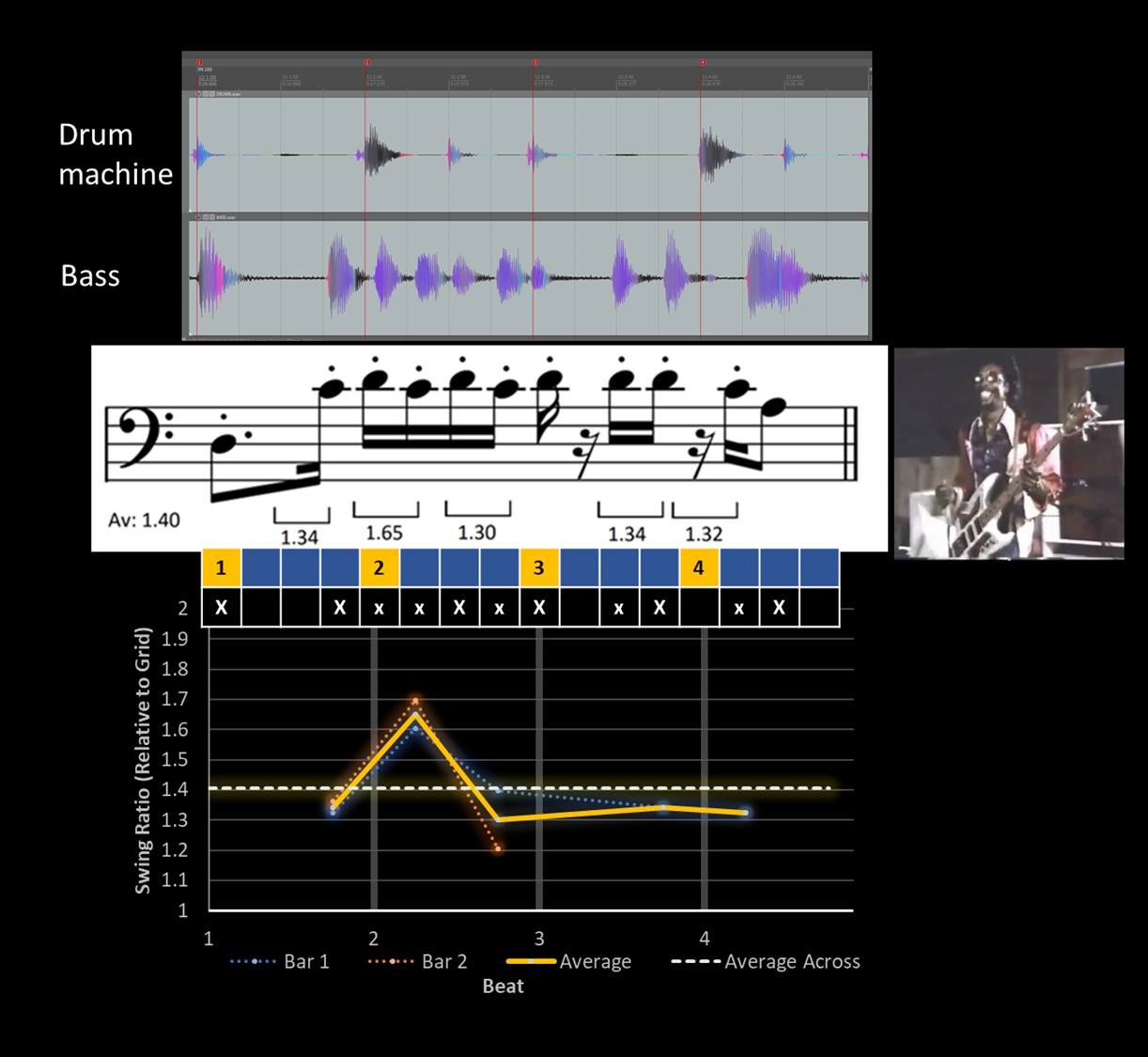 Looking at Bootsy Collins’ performance again, instead of simply measuring how early or late the timing of bass onsets is on every note, we can calculate the swing ratio between all pairs of odd- and even-numbered subdivisions. We find that the bass swings rather significantly (mean: 1.4) over the course of the two bars, sometimes swinging more and sometimes less—arguably supplying the groove with a certain degree of “bounce”. Again, the swing pattern is applied systematically across both bars. (Audio Ex. 6 gives the bass pattern isolated, without drum machine, looped 3 times).