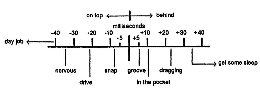 Different degrees of beat delay/anticipation are said to convey different types of ‘feels’. For example, delayed (late) back-beats in groove-styles are often described as “Laid-back”, and elicit a more “relaxed” feel when only slightly delayed, but a “heavy” or “dragging” feel if delayed too much. Anticipated (early) beats, on the other hand, are regularly described as “On-top/Pushed”, which at lower magnitudes might sound “snappy” and “driving”, but too much may sound “nervous” or “rushing”. Many scholars and musicians have attempted to develop their own heuristics as to what is the right degree of asynchrony in a given style. For example, MIDI-based electronic music producer Michael Stewart’s (in Prögler 1995) “feel spectrum,” which illustrates his prescriptions for an assortment of rhythmic feels at 130 beats per minute, for use with synthesizers and drum machines: