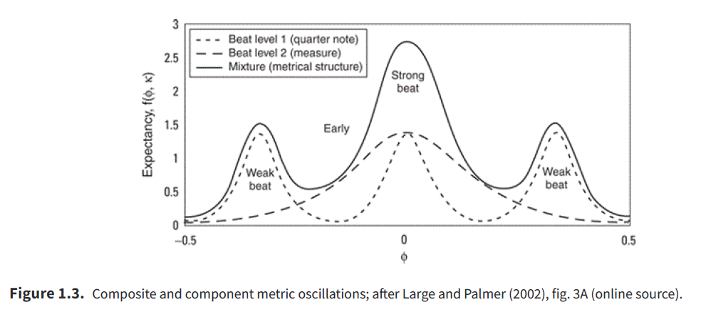 Meter can be thought of as a musically specific form of entrainment: we synchronize our attention (and often our movements) to periodicities in the sound. This synchronization sets up periodic peaks of attention—expectancy moments where events are most salient—and these peaks are arranged in hierarchies (subdivision, tactus/beat, bar, larger cycles). In this view, meter is less a printed grid and more a behavior of attention that locks to temporal invariants and shapes how we group notes and hear accents.