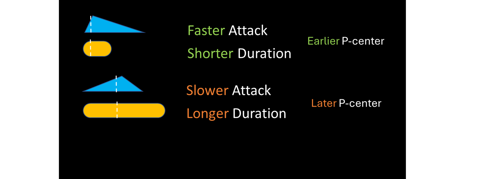 Studies show that certain sound parameters affect where P-centers are heard. Attack Duration or Time (time from onset to peak) is the strongest factor: faster attacks yield earlier P-centers; slower attacks yield later ones. Total duration (from onset to offset) exerts a weaker but similar influence—shorter sounds shift P-centers earlier; longer sounds shift them later.